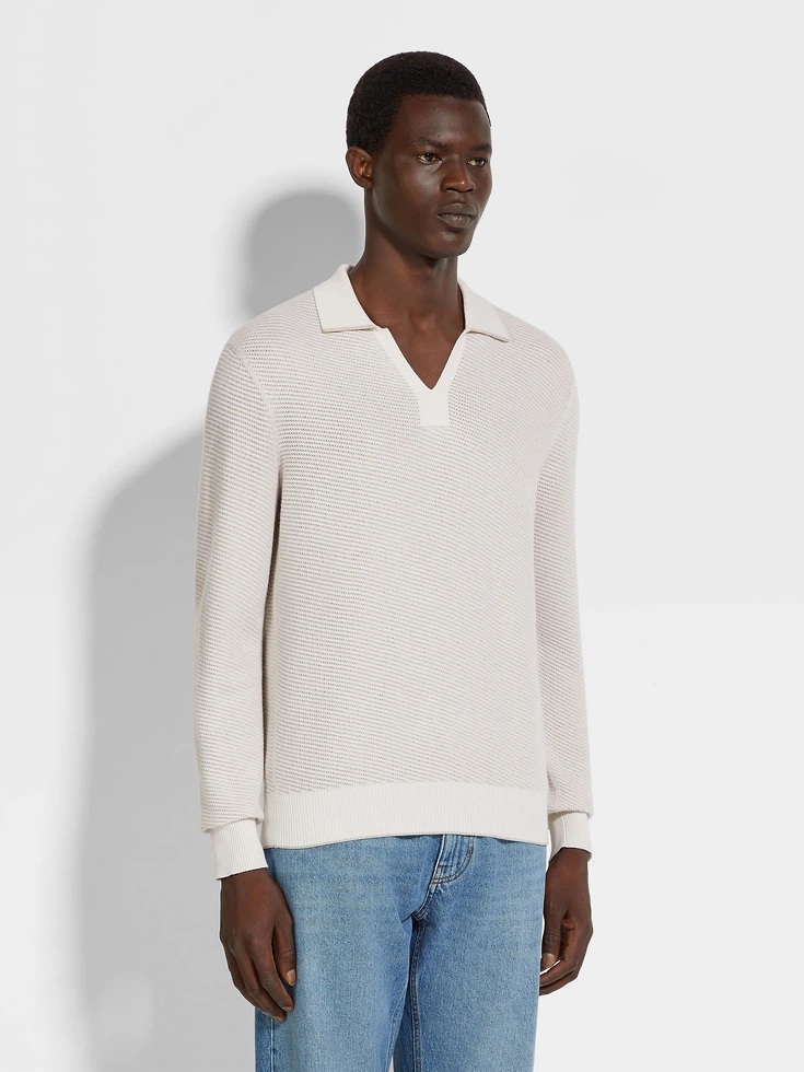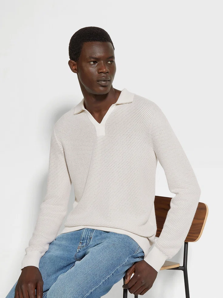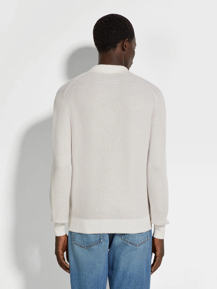 Crafted from a refined silk and cashmere blend, this white polo shirt slots effortlessly into your everyday rotation. A jacquard pattern and intarsia collar bring dynamic charm to its timelessly elegant long-sleeve silhouette.