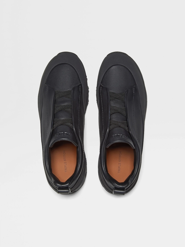 The black leather Triple Stitch™ Monte sneaker is a very versatile shoe, perfect all year round. The brand’s signature triple-crossed elastic detail ensures an easy slip-on fit, while evoking the traditional hand-stitching of tailored jackets to symbolize and honor Zegna’s legacy of fine craftsmanship. This elegant, casual shoe is lined with leather.MONTE (món·te) – ITALIAN FOR ‘MOUNT’Inspired by the trails of Oasi Zegna, the hiking-inspired Triple Stitch™ Monte Shoes are ideal for journeys at any time of year. Shaped to a versatile low-top silhouette and hallmarked with a trio of crosses inspired by the handmade stitches found on our Jackets, they’re set on an innovative sole — providing increased traction during outdoor pursuits.