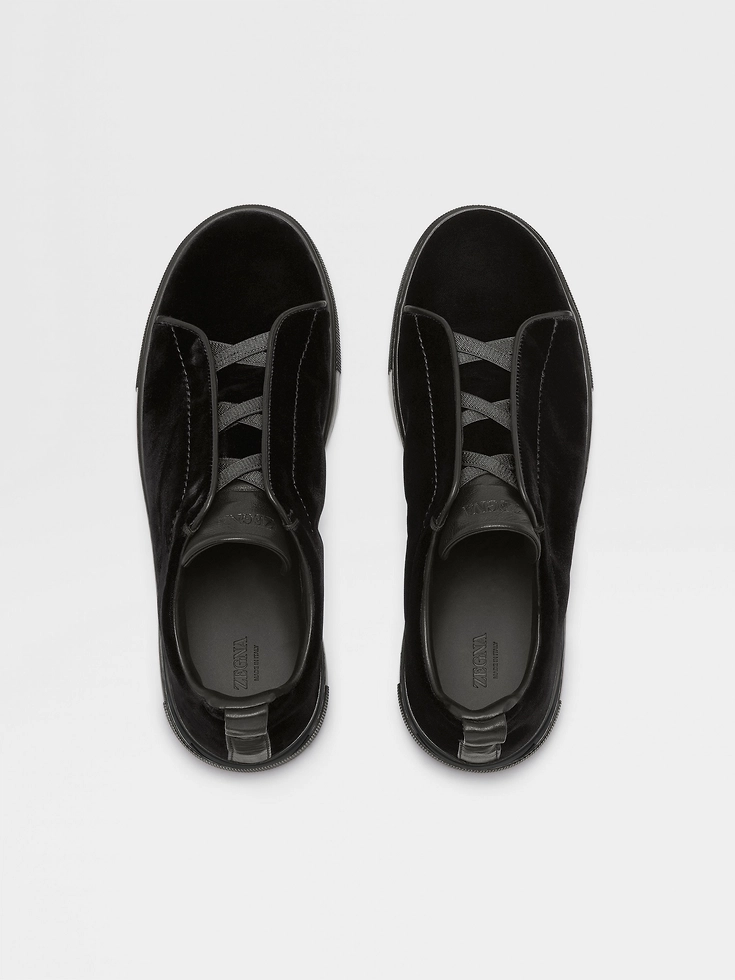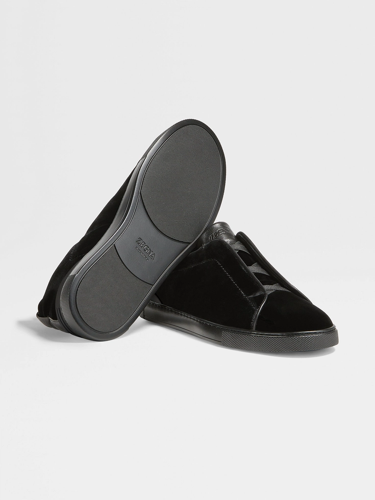 The black velvet Triple Stitch™ low top sneakers blur the lines between elegant shoes and casual footwear. They slip on easily thanks to the triple-crossed elastics, a nod to the hand-stitching on our tailored jackets. The durable rubber sole provides support and resilience to complement the effortless design.The Triple Stitch™ Shoes are an icon of ZEGNA’s contemporary wardrobe offering. Hallmarked with a namesake trio of crosses — inspired by the handmade stitches found on our Jackets — the comfortable slip-on style is available in an array of refined materials and set on a lightweight, flexible sole.