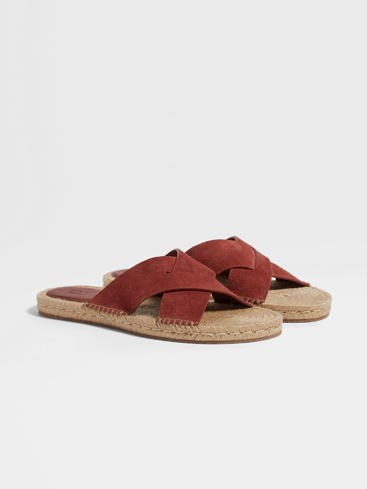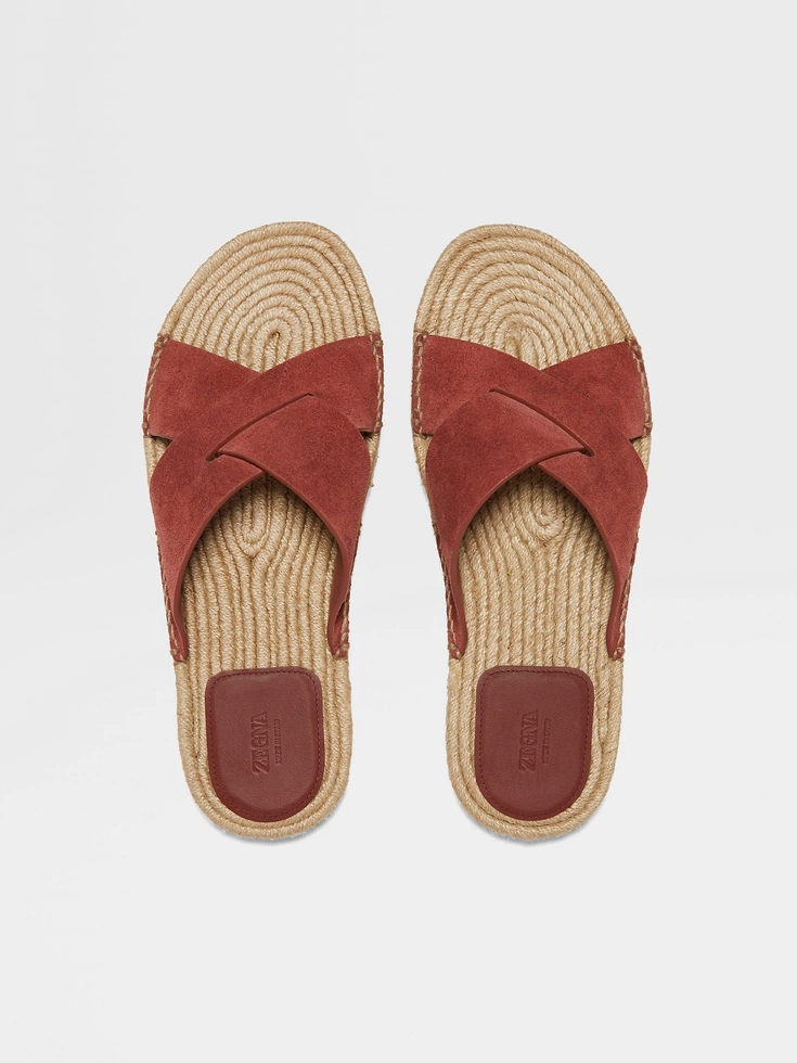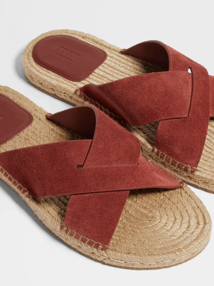 Crafted from luxury materials, the brick red suede espadrille sandals exemplify ZEGNA’s vision of effortless elegance. The roped midsole is paired with a durable rubber outsole.