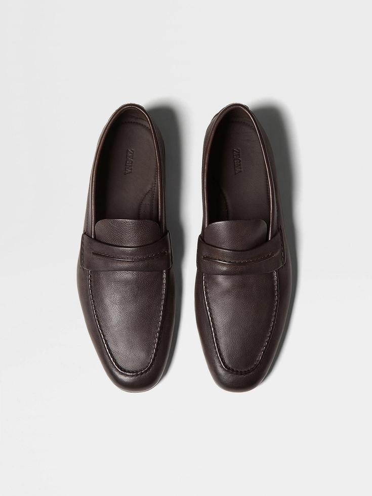Extremely soft Natural Grain Leather in an elegant dark brown traces the timeless lines of this Mocassin loafer. Crafted from the finest materials and designed for exceptional flexibility, every pair is meticulously hand-finished by experienced Artisans in order to obtain a luminous and refined shadowing. This Mocassin loafer is finished with a hand-stitched band featuring the signature ZEGNA 232 Road Brand Mark and a leather sole with rubber injection.Born in the streets of Italy, ZEGNA Mocassin embodies Italian craftsmanship and heritage. Its name comes from the way our Founder used to call this kind of shoe in the Piedmontese dialect—”mocassin”—reflecting a deep-rooted tradition.Designed for effortless elegance, it features the 232 Road Brand Mark—a tribute to ZEGNA’s journey. An Italian icon, it pioneers a new Mocassin family, redefining modern sophistication.