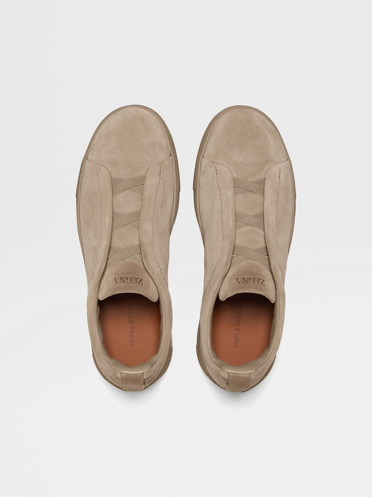The light taupe suede Triple Stitch™ sneakers are mounted on a tonal rubber sole for a sleek, monochrome look. The brand’s signature triple-crossed elastic detail ensures an easy slip-on fit, while evoking the traditional hand-stitching of tailored jackets to symbolize and honor Zegna’s legacy of fine craftsmanship. Foliage-colored leather lining completes the look.The Triple Stitch™ Shoes are an icon of ZEGNA’s contemporary wardrobe offering. Hallmarked with a namesake trio of crosses — inspired by the handmade stitches found on our Jackets — the comfortable slip-on style is available in an array of refined materials and set on a lightweight, flexible sole.