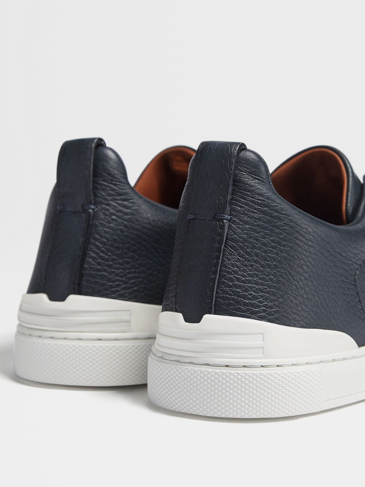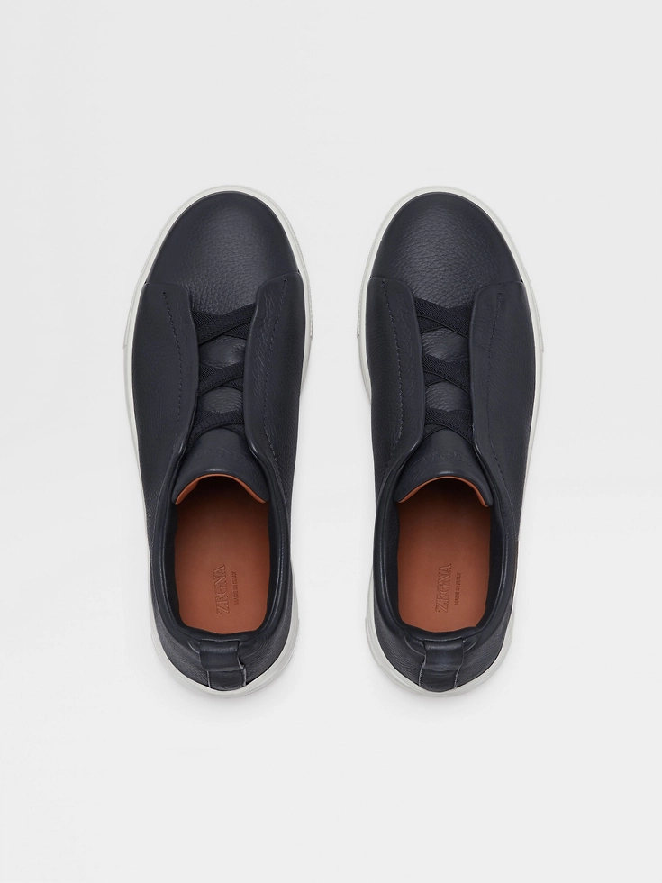 The navy blue deerskin Triple Stitch™ low-top sneakers are mounted on an extra-light, white rubber sole for a pop of contrast. The brand’s signature triple-crossed elastic detail ensures an easy slip-on fit, while evoking the traditional hand-stitching of tailored jackets to symbolize and honor Zegna’s legacy of fine craftsmanship. Foliage-colored leather lining completes the design.