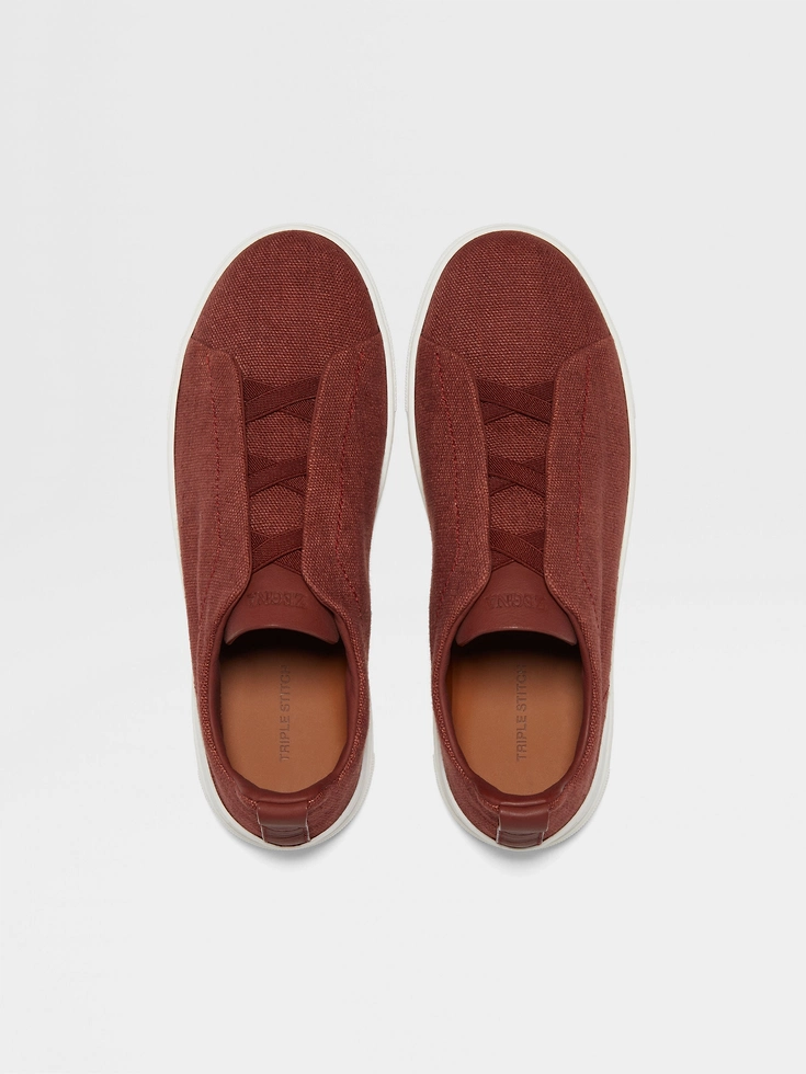 A breezy take on Zegna’s emblematic shoe, these red Triple Stitch™ sneakers are crafted from a charming cotton and linen blend. Their iconic silhouette is lined in sleek Foliage-colored leather and supported by a fresh white rubber sole, secured with the design’s signature triple-crossed elastics.The Triple Stitch™ Shoes are an icon of ZEGNA’s contemporary wardrobe offering. Hallmarked with a namesake trio of crosses — inspired by the handmade stitches found on our tailoring — the comfortable slip-on style is available in an array of refined materials and set on a lightweight, flexible sole.