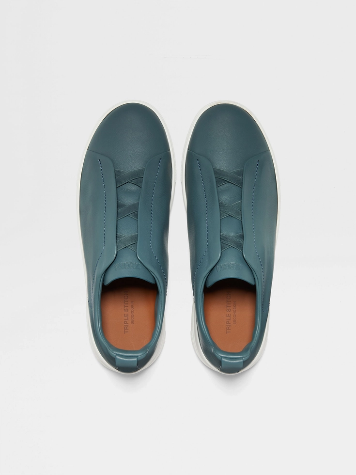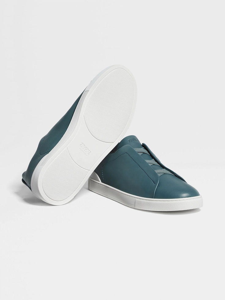 The teal blue Triple Stitch™ SECONDSKIN sneakers are crafted from specially selected calf leather for even more flexibility. The brand’s signature triple-crossed elastic detail ensures an easy slip-on fit, while evoking the traditional hand-stitching of tailored jackets to symbolize and honor ZEGNA’s legacy of fine craftsmanship. The super soft, light uppers are complemented by a Foliage-colored rubber sole.The Triple Stitch™ SECONDSKIN shoes are the result of more than a century of generational craftsmanship, the sharing of wisdom, and dedication to innovation. Crafted from our SECONDSKIN leather, which ensures a glove-like fit, they are ideal for travelling in exceptional style and comfort.