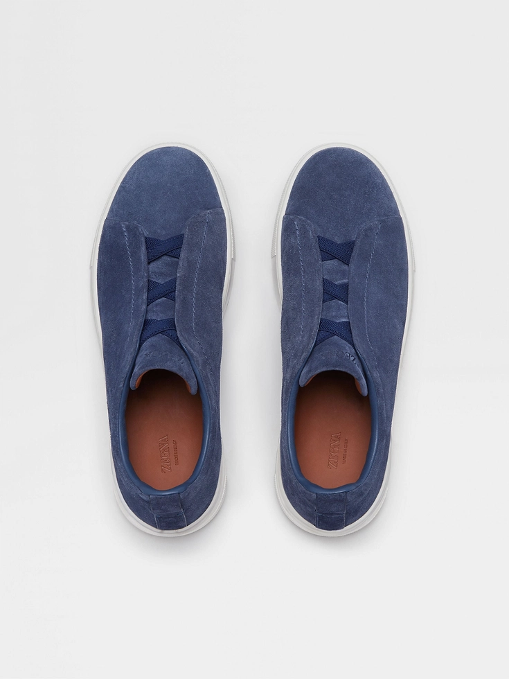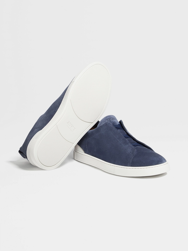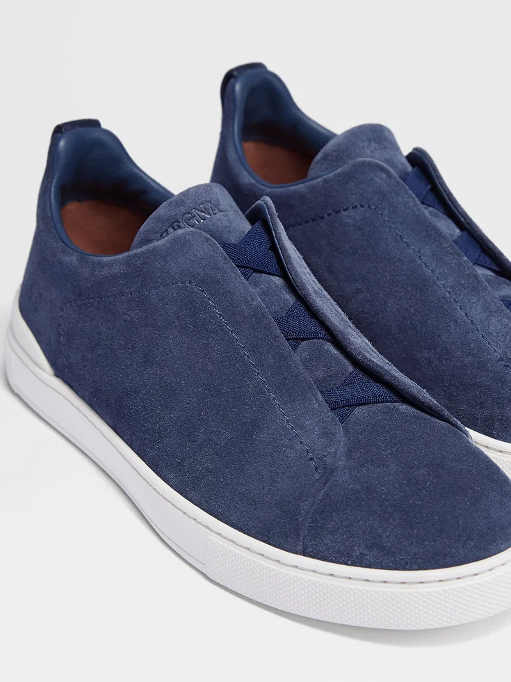 The utility blue suede Triple Stitch™ low-top sneakers’ construction makes them lightweight and flexible. The brand’s signature triple-crossed elastic detail ensures an easy slip-on fit, while evoking the traditional hand-stitching of tailored jackets to symbolize and honor Zegna’s legacy of fine craftsmanship. Foliage-colored leather lining completes the look.